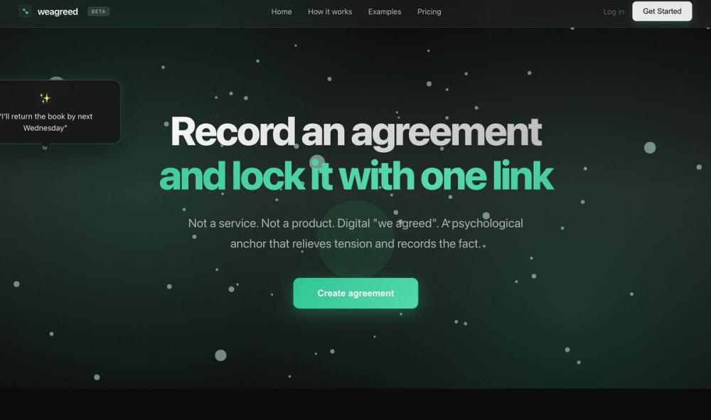 Real example (fictional but real-feeling) Agreement: I will design a homepage by Feb 28 for $350. Status: Confirmed by both Link: weagreed.space/abc123